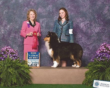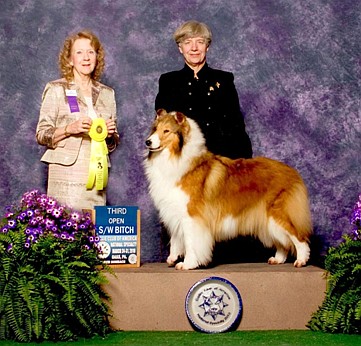 "American Bred Rough Bitches: This large class was very deep in quality with many lovely bitches and not enough ribbons. The first place went to Countryview Broadway Starr, a lovely sable bitch who on my first look down the line had everything going for her. Her eye was absolutely correct-the shape, the placement, the color and the radiant sweet expression. She had a lovely balanced head from every angle...light and clean with length that balanced her body. The skull was flat and filled, the muzzle full and round and the lipline was tight. She was sound and balanced in body and her gait was effortless."