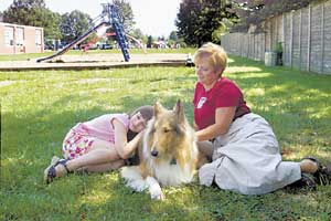 | Second-grade teacher Cheryl Landford and Prospect Elementary student Kristen spend time with therapy dog Max. Max helped Kristen overcome her shyness at school. |